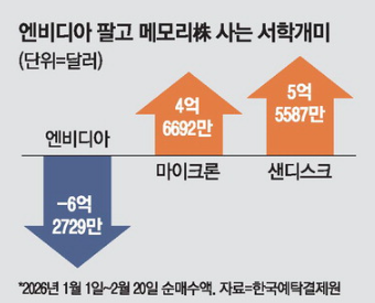 서학개미는 이 기간 마이크론(4억6692만달러)과 샌디스크(5억5587만달러)에 대규모 순매수 자금을 퍼부었다. 최근 AI 투자의 병목 현상이 그래픽처리장치(GPU)보다 메모리 반도체에서 심해질 것으로 예측되며 국내에서 삼성전자와 SK하이닉스가 초강세를 보이자, 서학개미도 발 빠른 순환매에 나섰다.