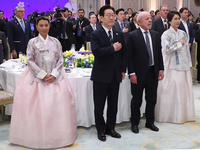 | ▲ 호잔젤라 다시우바 브라질 영부인이 23일 청와대에서 열린 국빈 방한 환영 만찬에 한복을 입고 참석해 있다. 왼쪽부터 다시우바 여사, 이재명 대통령, 루이스 이나시우 룰라 다시우바 브라질 대통령, 김혜경 여사. 2026.2.23 |