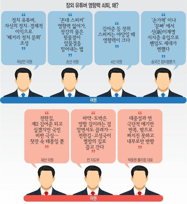 야권 스피커는 역사가 짧은 만큼 기반 자체가 공고하지 않다는 평가다. 윤어게인 성향 유튜버 전한길씨는 최근 유튜브 방송에서 “윤석열 전 대통령을 중심으로 제2의 건국을 할 것”이라는 황당한 주장과 함께 100억원대 ‘건국 펀드’ 모금 계획을 밝혔다가 강성 보수층에서조차 반발을 샀다. 박동원 폴리컴 대표는 “단단한 기반 자체가 없기에 논리적 타당성이 없고 얼토당토않은 말을 하면 쉽게 흐트러질 수밖에 없다”고 말했다.