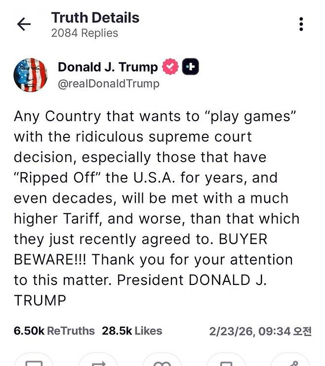 트럼프 대통령은 23일(현지시간) 소셜미디어 트루스소셜에 "대법원의 터무니없는 판결을 이용해 '꼼수(play game)' 부리려는 국가들은, 특히 수년 심지어 수십 년간 미국을 '뜯어 먹어온' 곳은, 최근 합의했던 것보다 훨씬 더 높고 가혹한 관세에 직면하게 될 것"이라고 밝혔다.