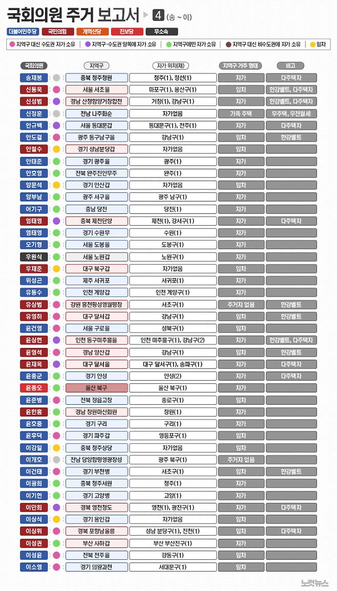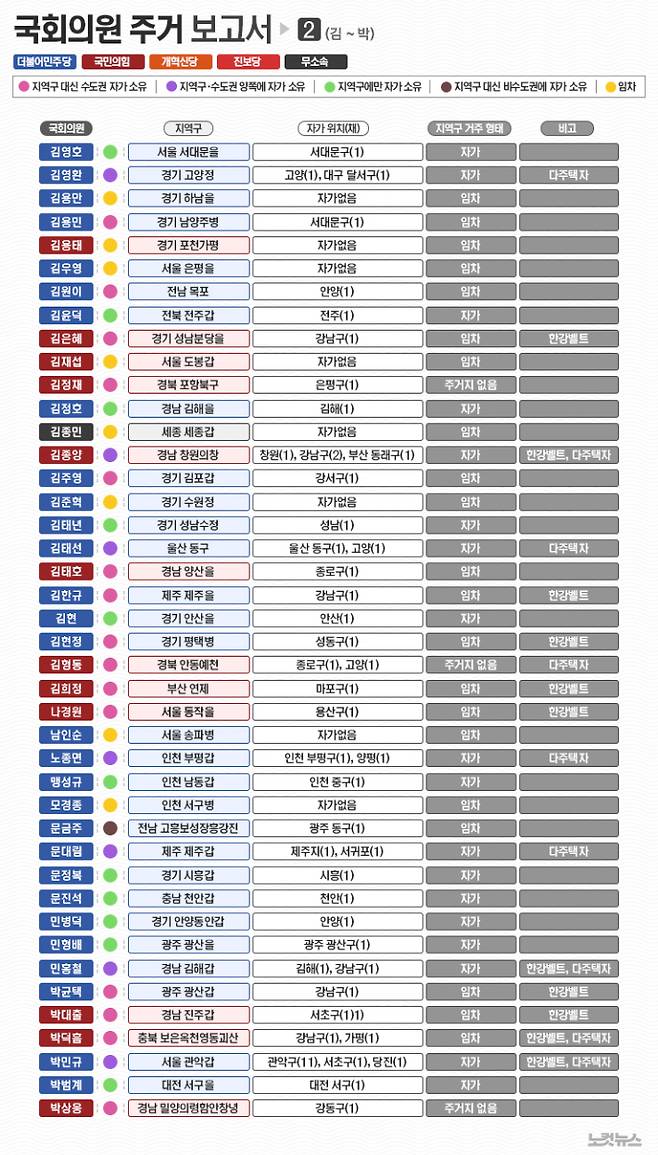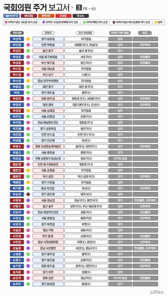 이번에는 마지막 회로 각 유권자들이 자신의 지역구 의원의 주택 보유 현황을 찾아보기 쉽게 가나다 순으로 묶어서 펴냅니다. 가독성을 감안해 6장의 표로 나눠 실었습니다. 검색해서 확인할 수 있게 활자화된 명단도 하단에 함께 게재했습니다. 이 기사를 포털에서 접하신 분들은 노컷뉴스 사이트를 방문해주실 것을 권유합니다. 그 곳에서는 인터렉티브 지도를 통해 보다 직관적으로 국회의원들의 주거 현황을 확인할 수 있습니다.