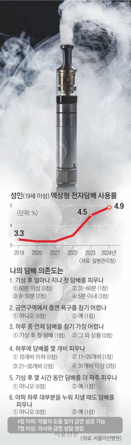 이씨와 같은 선택을 하는 이들이 늘면서 담배 시장의 흐름도 바뀌고 있다. 23일 국민건강영양조사에 따르면 2024년 기준 일반 연초 담배 흡연율은 남녀 모두 감소했지만 전자담배 사용률은 오히려 증가했다. 액상형 전자담배 현재 사용률은 50대 남성에서 3.0%포인트, 궐련형 전자담배는 40대 남성에서 6.9%포인트 상승했다. 담배를 끊는 대신 제품만 바꾸는 ‘풍선효과’가 나타나고 있는 것이다. 냄새는 피하고 싶지만 니코틴은 놓지 못하는 이들에게 전자담배는 손쉬운 대안처럼 보인다.