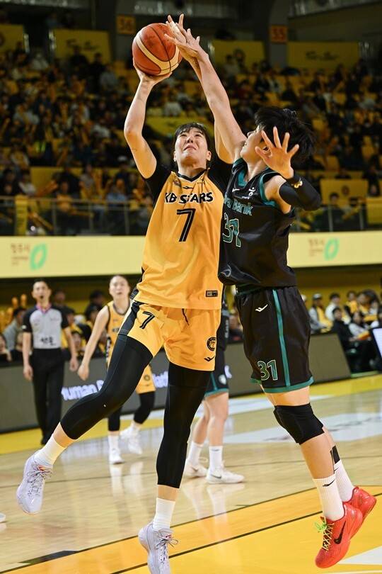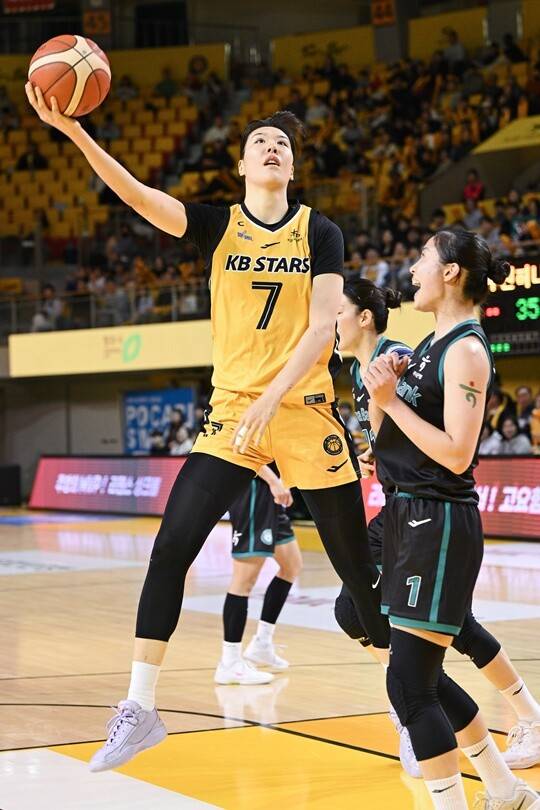 이를 지켜본 KB 벤치는 2쿼터 종료 5분 29초 전 박지수를 불러들였다. 다시 들어간 송윤하가 진안을 블록슛했다. 강이슬이 다음 공격 때 3점을 성공. KB는 박지수 없이도 달아났다. 2쿼터 종료 4분 22초 전 35-24를 기록했다.