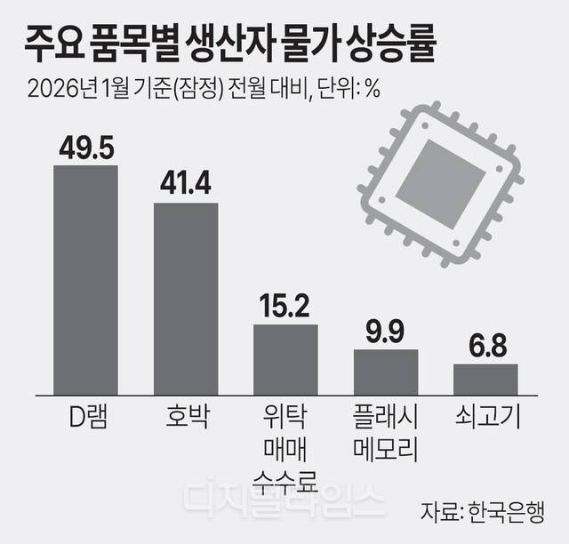지난달 생산자물가가 전월보다 0.6% 오르며 다섯 달 연속 상승했다. 특히 D램 등 메모리 관련 제품의 가격이 급등했다. 이른바 ‘D램플레이션’ ‘메모리플레이션’이 지표로 확인된 것이다.