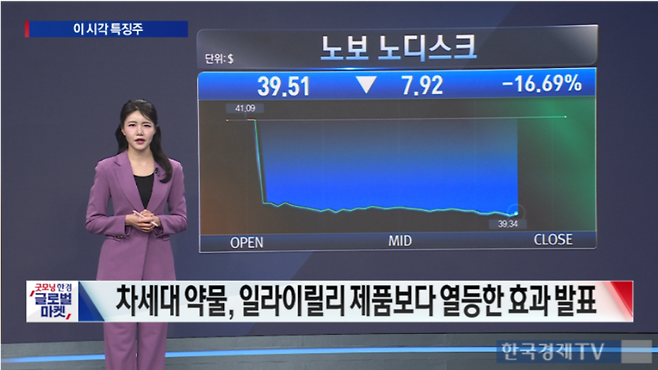이 소식이 전해지며 노보 노디스크 주가는 16%가 넘게 하락한 반면 경쟁사 일라이 릴리는 4.86% 강세로 마감했다.