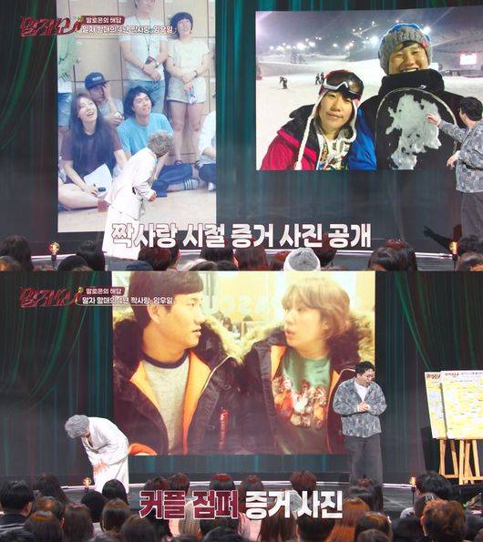 이후 스크린에는 증거 사진이 공개됐다. ‘개그콘서트’ 연습실, 스키장에서 찍은 김영희와 임우일의 다정한 투샷이었다. 김영희는 "스키장만 간줄 아냐. 오만군데 다 갔다. (임우일이) 후배인데 오빠다. 그냥 저는 그런 남루한 모습과 회의실 중간 복도에서 후배들은 사실 배를 못 채운다. 갓 들어와서 선배들 쫓아다니면서 일하기 바쁘다. 근데 끼니를 악착같이 채워넣는. 이 오빠 우나 싶어서 보면 뭘 주워 먹고 있는 모습들이 보호본능이 일어났던 것 같다. 모성애가 들끓었던 것 같다. 그러면서 사람이 되게 담백하다. 군더더기 없이. 그런 모습에 내가 반하게 된거다"라고 설명했다.