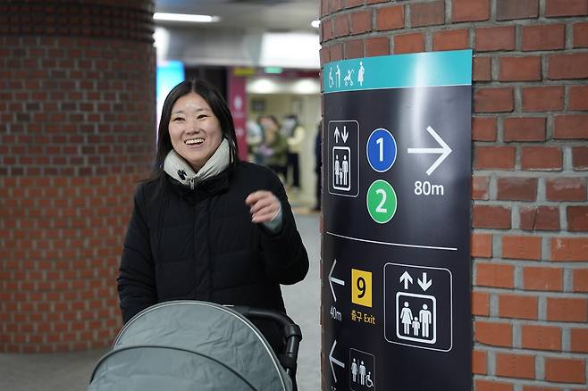 | ▲ 서울시청역에 부착된 모두의 지하철 교통약자 길안내 표지 앞에서 유아차를 동반한 리서치 참여자가 미소짓고 있다. |