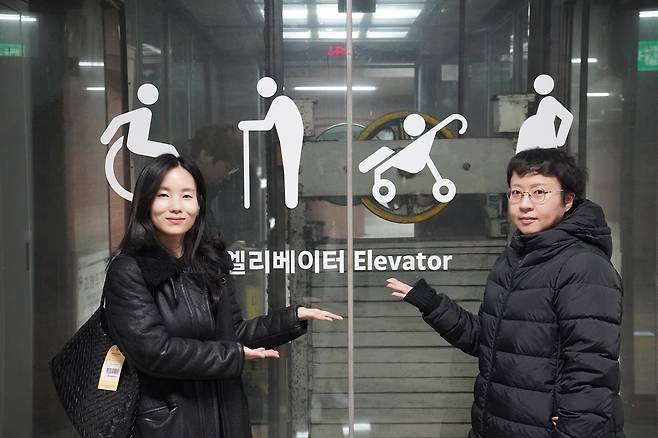 | ▲ 모두의 지하철 디자인 총괄 홍대 이연준 교수(오른쪽)와 무의 황시인 책임매니저가 시청역에 시범설치된 교통약자 안내표지 중 대형 엘리베이터 교통약자 픽토그램을 가리키고 있다. |