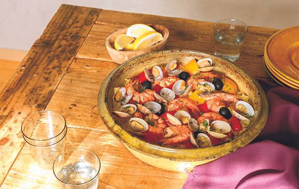 쌀 360ml(2홉), 머리 떼고 껍질 있는 상태의 새우 8마리, 빨강·주황 파프리카 1/2개씩, 해감한 바지락 200g, 씨를 제거한 블랙올리브 6알, 빗 모양으로 썬 레몬 슬라이스 1/2개, 다진 파슬리 적당량