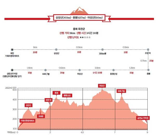 '천성장마'는 천태산 영국사에서 시작해 옥천읍 마성산까지 남에서 북으로 길게 이어진 능선 상의 4개 산 '천'태산, 대'성'산, '장'령산, '마'성산의 이름을 한 글자씩 따서 만들어진 약 26km 코스다.