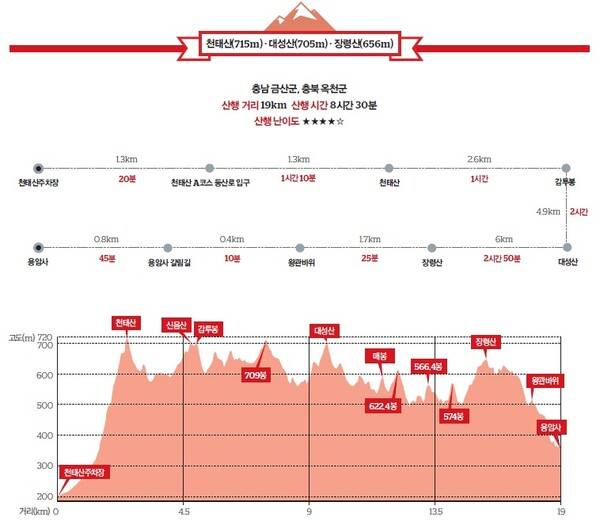 천태산(715m), 대성산(705m), 장령산(656m), 마성산(510m). 일부러 산 높이 순서대로 늘어놓은 듯 이 코스는 가장 높은 곳부터 시작해 빨래판처럼 30여 개 봉우리를 오르내린다. 쉽지 않다. 산행 구간 내내 식수와 먹거리를 보충할 곳도 없다. 중간 보급을 받는다면 장령산과 마성산 사이 사목재 한 곳에서만 가능하다.