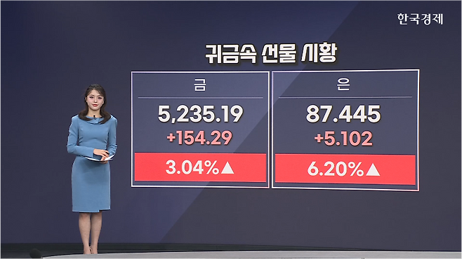 오늘장 귀금속 선물. 강한 상승 탄력 받았습니다. 오전 5시 10분 기준, 금 선물이 3% 상승한 5,235달러에 거래됐고요. 거의 4주래 최고치 부근에서 움직였습니다. 은 선물은 6.2% 올라 87달러 중반에 거래됐습니다.