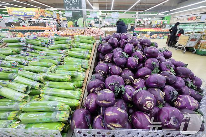 (서울=뉴스1) 황기선 기자 = 24일 서울 시내 한 대형마트 농축산물 코너에서 시민들이 장을 보고 있다.