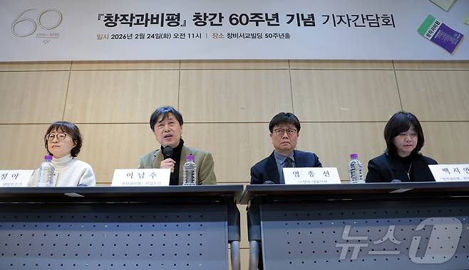 (서울=뉴스1) 권현진 기자 = 이남주 편집주간(왼쪽 두번째)이 24일 오전 서울 마포구 창비서교빌딩 50주년홀에서 열린 '창작과비평' 창간 60주년 기념 신년 기자간담회에서 인사말을 하고 있다.