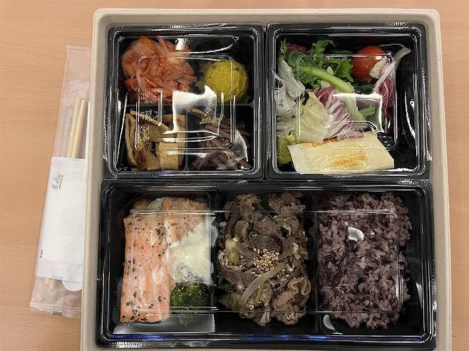 | ▲ 참석자에게 주는 도시락. 샐러드와 연어 스테이크를 먼저 먹고 밥과 불고기로 마무리. |