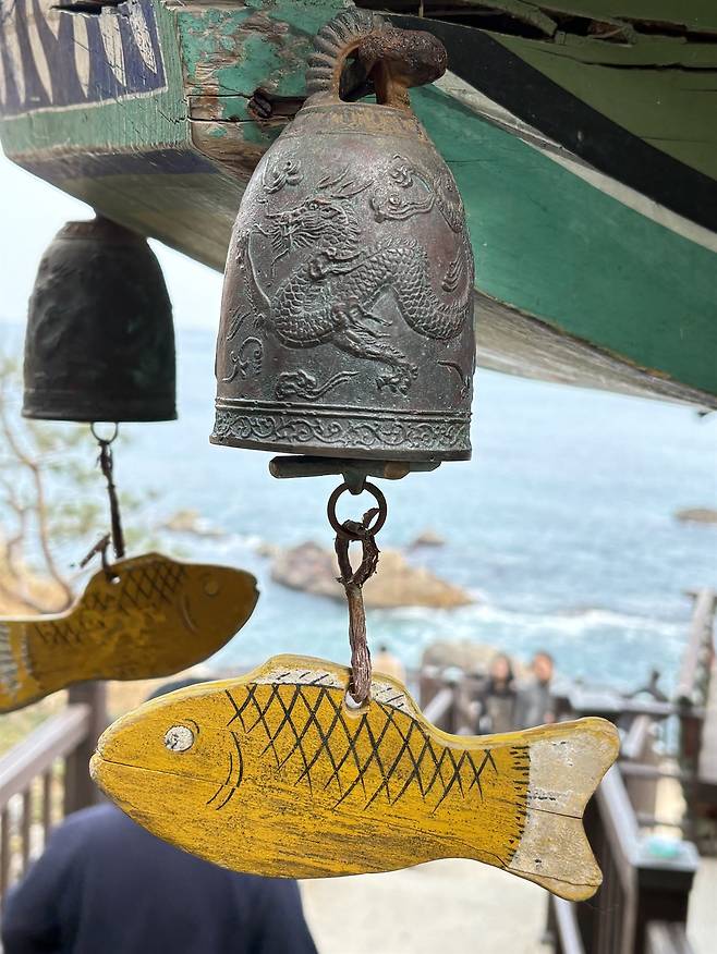 특히 바다를 마주한 의상대와 홍련암은 그 자체로 장관이다. 의상대를 지나 홍련암으로 오르는 계단 옆 연하당 처마 끝의 풍경이 유독 눈길을 사로잡았다. 바닷가 사찰답게 물고기 모양이었다. 파도 소리와 풍경 소리가 어우러지며 절로 마음이 고요해졌다.