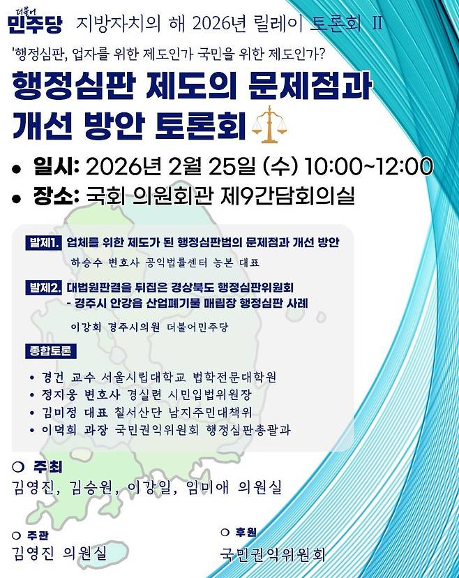 국회 재정경제위원회 김영진(민주‧수원병) 의원은 25일 국회의원회관 제9간담회의실에서 '지방자치의 해 2026년 릴레이 토론회Ⅱ–행정심판, 업자를 위한 제도인가 국민을 위한 제도인가? 행정심판 제도의 문제점과 개선 방안' 토론회를 개최한다.