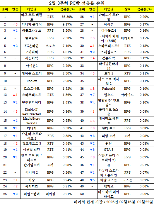 한 주간의 PC방 순위를 되짚어 보고, 어떤 변화가 있었는지 알아보는 'PC방순위' 코너입니다. 데일리게임은 매주 PC방 순위를 일목요연하게 정리, 독자들이 알아보기 쉽도록 제공합니다. 지난 한 주간 어떤 PC 온라인게임들이 눈길을 끌었는지 살펴봤습니다. < 편집자주 >