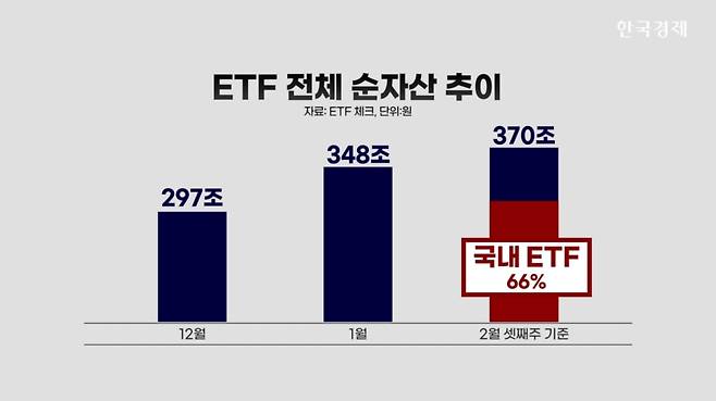 ETF 순자산은 370조원으로 올 연초 이후 무려 73조원이 늘어났습니다. 특히 이 중에서 국내 주식형 ETF로 유입된 자금이 전체 ETF 순자산에 62조원에 달합니다.