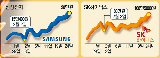 시가총액 1위 삼성전자는 3.63% 오른 20만원으로 마감하며 역사상 처음으로 20만원 고지에 올랐다. SK하이닉스도 5.68% 오른 100만5000원을 기록하며 마침내 100만원 선을 돌파했다.