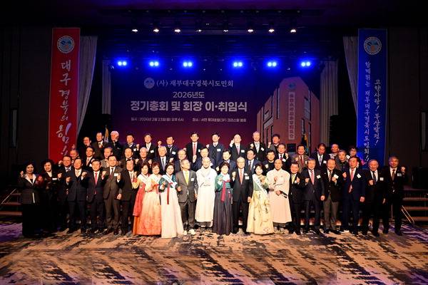 ㈔재부대구경북시도민회가 23일 롯데호텔 부산 크리스탈 볼룸에서 '2026 정기총회 및 회장 이·취임식'(사진)을 열고 이윤희 회장 체제를 출범시켰다.