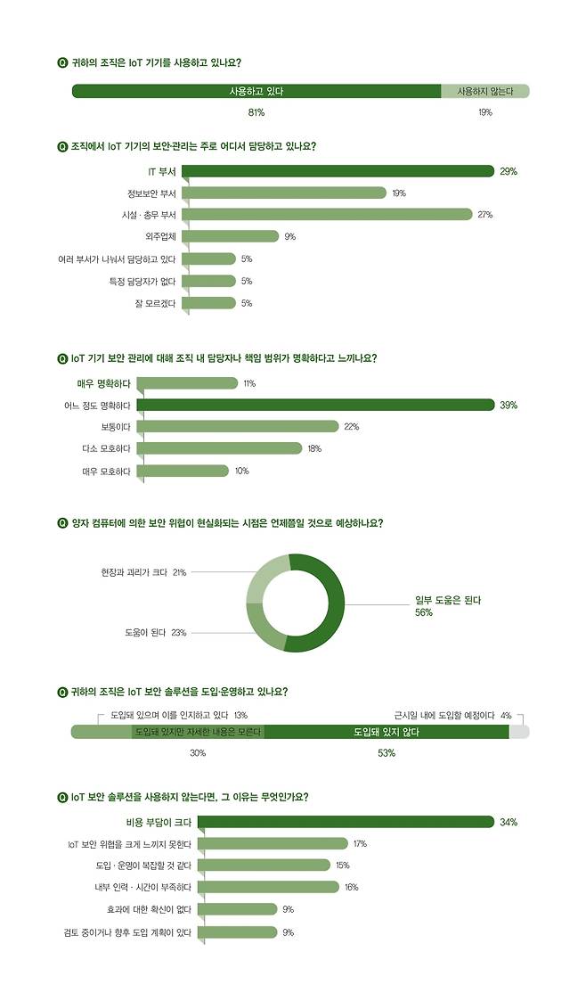IoT 보안 솔루션 도입 여부를 묻는 질문에는 53%가 ‘도입돼 있지 않다’고 답했으며, 30%는 ‘도입돼 있지만 자세한 내용은 모른다’고 응답했다.