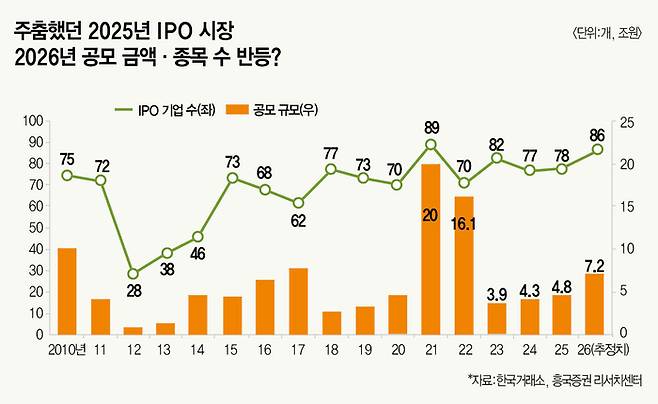 지난해 기업공개(IPO) 시장은 다소 아쉬움이 남았다. 일단 상장 기업 수가 예년 대비 크게 줄었다. 지난해 상장 기업 수(코스피·코스닥 합산)는 108개(스팩 등 포함)로 최근 5년(2020~2024년) 평균인 132개 대비 저조했다. 상장 기업 수가 줄다 보니 공모 금액도 4조8000억원에 그쳤다. 최근 5년 평균(10조3000억원)의 절반 수준이다. 공모 금액이 조 단위인 대어급 IPO 후보가 많지 않았던 영향으로 풀이된다. 공모 금액이 1조원을 넘는 IPO는 지난해 2월 LG CNS 이후 사실상 끊긴 상태다.