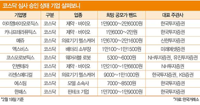 자연스레 후발 주자도 주목받는 분위기다. 한국거래소에 따르면 2월 19일 기준 코스닥 IPO 절차를 밟고 있는(심사 승인 상태) 기업은 9곳(스팩 제외)이다. 업종별로 구분하면 바이오텍 등 바이오 부문이 3곳(아이엠바이오로직스·카나프테라퓨틱스·인벤테라)으로 가장 많다. 그 다음 의료기기 등 헬스케어(메쥬·리센스메디컬)와 로봇과 배터리 소부장 등 제조업(액스비스·코스모로보틱스)이 각각 2곳이다. 이외엔 모델 소속사 에스팀과 핀테크 기업 한패스가 이름을 올렸다.