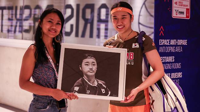 드라마 같은 이야기는 지난해 8월 프랑스 파리에서 개최된 2025 세계배드민턴선수권대회 현장에서 시작됐다. 당시 16강에서 동료 심유진을 꺾고 8강에 안착하며 거침없는 기세를 보여준 안세영은 경기 후 예상치 못한 특별한 선물을 마주했다. 마다가스카르 국가대표 선수 출신이자 현재는 기자와 예술가로 활동 중인 미앙골라 라자피니마나나가 안세영을 위해 정성껏 그린 초상화를 들고 나타났다.