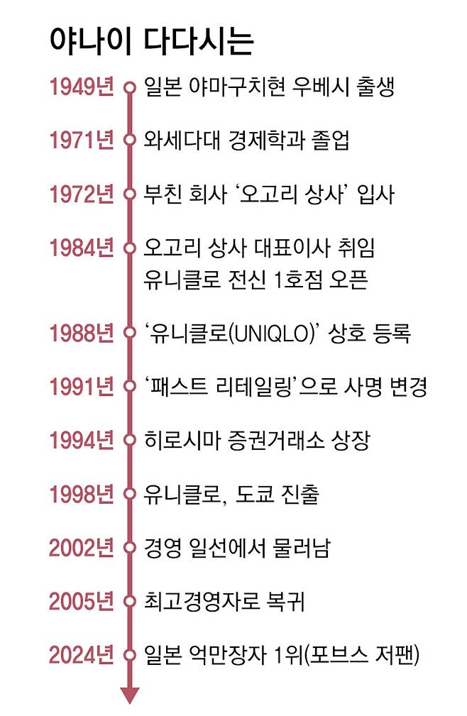 야나이는 1949년 일본 야마구치현의 소도시에서 태어났다. 그의 아버지는 지역 기반의 남성복 매장 ‘오고리 상사’를 운영했다. 그는 훗날 “나는 사업가가 되고 싶지 않았다”고 회상했다. 와세다대 졸업 후 유통업체에서 일했지만 오래 버티지 못하고 아버지의 가게로 돌아왔다. 원치 않았던 가업 승계였다.