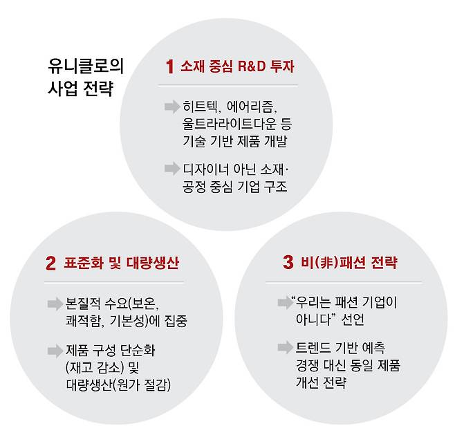 이는 패션 기업이 수요를 예측하려 할 때 유니클로는 수요를 구조화한다는 점에서도 드러난다. 겨울의 따뜻함과 여름의 쾌적함에 대한 인간의 욕구는 유행에 따라 크게 변하지 않는다. 야나이는 이 변하지 않는 본질적 수요에 집중했다. 그 결과 유행의 변동성에서 비교적 자유로워졌고, 제품 구성을 단순화해 대량 생산에 따른 원가 절감과 재고 리스크 감소를 동시에 이뤘다. 감성 산업에 엔지니어링 사고를 도입한 것이다.