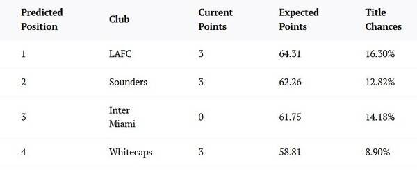 실제 예측에 따르면 LAFC의 우승 확률은 16.30%로 리그 전체에서 가장 높았으며, 예상 승점은 64.31점으로 서포터스 실드 경쟁에서도 선두를 달릴 가능성이 큰 것으로 나타났다.