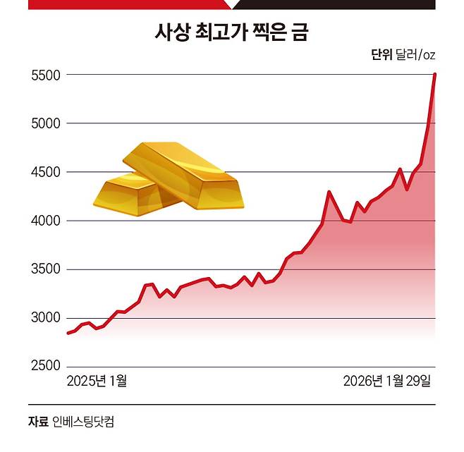 이날 금과 은은 동시에 사상 최고가를 달성했다. 지난해에만 65% 급등한 국제 금 가격은 사상 처음으로 온스당 5200달러를 넘어섰고 은 현물 가격도 1월 28일 온스당 113달러 선까지 올라서며 사상 최고치를 갈아치웠다.