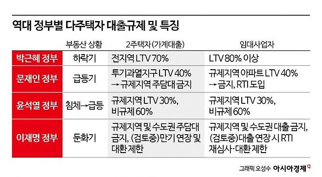 역대 정부의 다주택자에 대한 대출 규제는 집값 급등기 또는 하락기 등 부동산 시장 상황에 따라 냉·온탕을 오갔다. 부동산과 다주택자를 바라보는 정권 기조도 대출 규제에 영향을 미쳤다. 다주택자에 대한 주택담보대출은 주로 자산 증식 억제에 초점을 두고 신규 대출을 어렵게 하는 방향으로 규제가 진행돼왔다. 반면 임대사업자의 경우 제도 도입 초기에는 장려됐지만 집값 급등기 투기 통로로 지목되며 강력히 차단되는 과정을 겪었다.