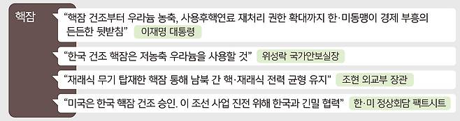 정부는 대미 실무협의와 정부 내 준비를 서둘러왔다. 11월 미국의 상·하원 선거(중간선거)에서 공화당이 패하면 트럼프 행정부의 정책 추진 동력이 떨어질 우려에서다. 따라서 11월 전에 핵잠 건조와 원자력협정 등의 협의를 속전속결로 진행, 불가역적 상황을 만드는 것이 중요하다고 정부 관계자들은 판단하고 있다. 이에 따라 국방부는 핵잠 건조에 대한 특별법 제정 및 대미 협상 준비를 진행하고 있다. 올해 안에 핵잠과 관련한 원칙과 건조계획, 비확산에 대한 입장 등을 포함한 ‘한국형 핵잠 기본계획’을 제시할 예정이다.