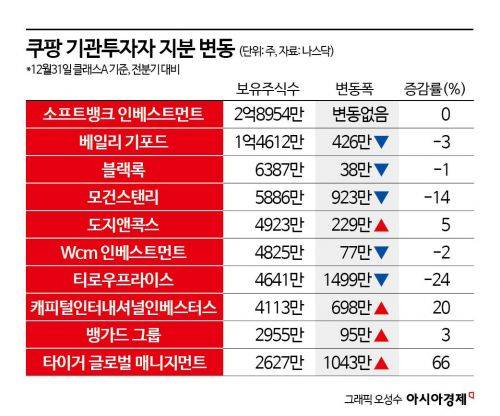 뉴욕증시에 상장된 쿠팡 모회사 쿠팡Inc가 '개인정보 유출 사태' 속에서도 기관투자가 비중 80%대를 유지했다. 연말 주요 주주 일부가 보유 지분을 축소했지만, 일부 투자자들은 추가 매입에 나선 것으로 나타났다.