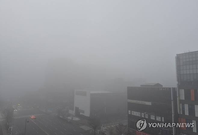 (전주=연합뉴스) 김동철 기자 = 안개가 짙게 낀 25일 오전 전북 전주시 완산구 효자동 일대에서 차들이 서행 운전을 하고 있다. 2026.2.25