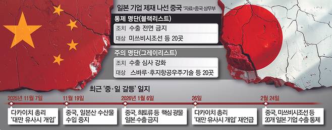 그러나 다카이치 총리가 높은 지지율을 기반으로 기존 입장을 굽히지 않자 개별 기업을 겨냥한 보복 조치를 내놓은 것이다. 중국이 일본의 특정 기업을 직접 제재한 것은 이번이 처음이다.