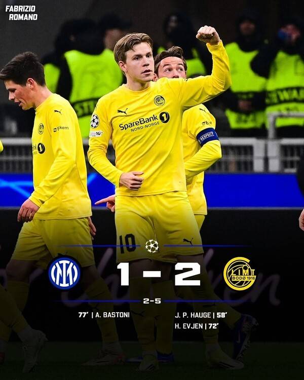 보되/글림트는 25일(한국시간) 이탈리아 밀라노 산시로에서 열린 2025/26시즌 UEFA 챔피언스리그(UCL) 녹아웃 플레이오프 2차전에서 인터 밀란을 2-1로 꺾고, 합계 스코어 5-2로 16강 진출에 성공했다.