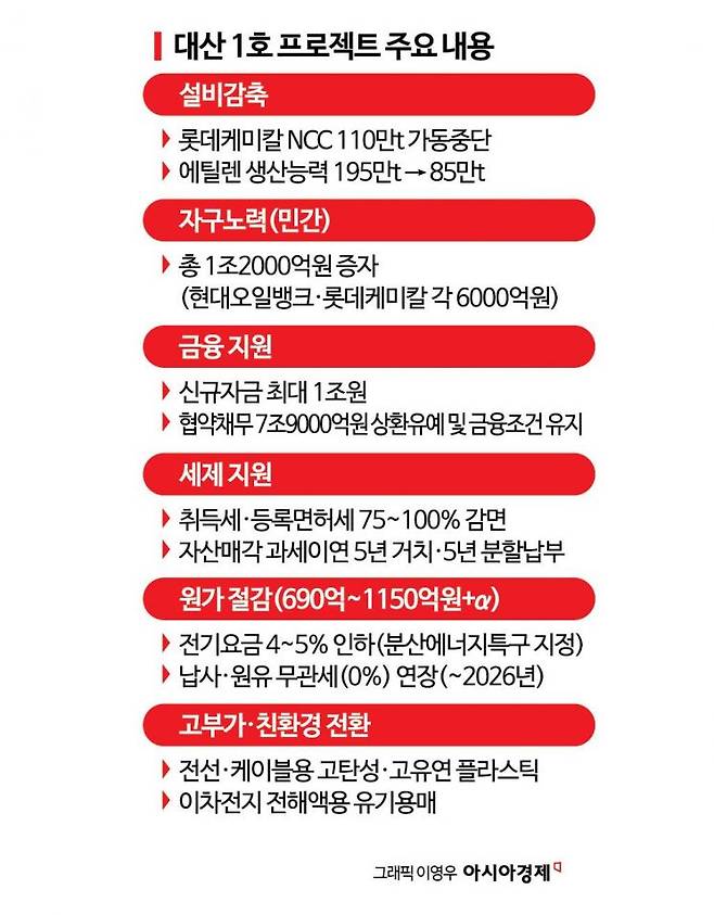 이번 구조개편 모델의 또 다른 특징은 기업 자구노력에 정책금융을 매칭한 구조다. 현대오일뱅크와 롯데케미칼은 각각 6000억원씩 총 1조2000억원을 증자한다. 이에 맞춰 채권단은 신규자금 최대 1조원, 기존 대출의 영구채 전환 최대 1조원을 지원하는 방안을 마련했다. 기존 협약채무 약 7조9000억원에 대한 상환유예와 금융조건 유지까지 포함하면 금융 안정장치는 최대 9조9000억원 규모로 설명된다.