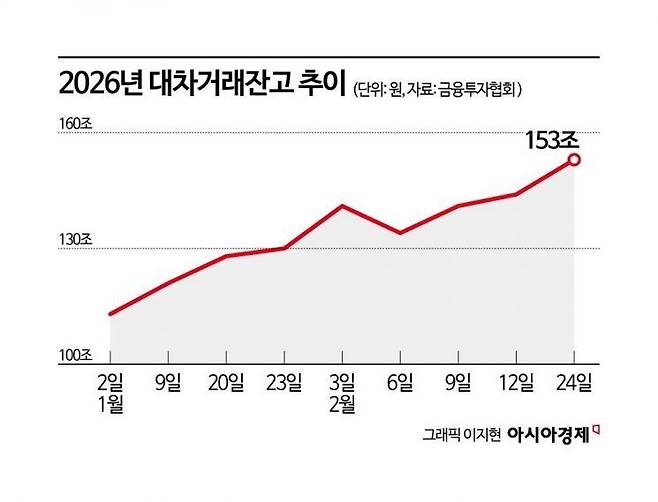 다만 일각에서는 과도한 증시 낙관론을 경계하며 지수 하락 베팅도 늘고 있다. 금투협에 따르면 대차거래 잔고 금액은 전날 기준 153조131억원으로 집계됐다. 지난달 말 138조6285억원에서 13거래일 만에 14조원 넘게 증가했다. 대차거래는 투자자가 다른 투자자에게 일정한 수수료를 받고 주식을 빌려주는 거래로, 통상 공매도의 선행 지표로 여겨진다.