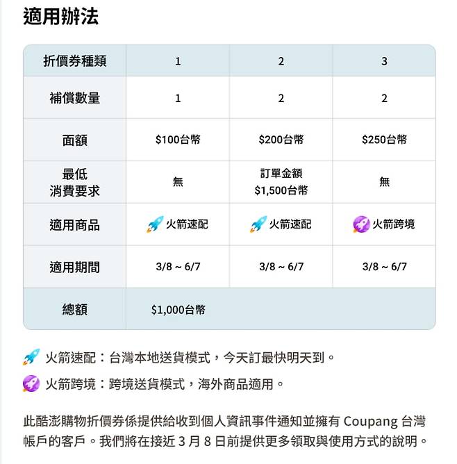 쿠팡은 대만 회원들을 위한 보상 방안도 함께 발표했다. 계정 정보가 유출된 회원에게 1000대만달러(약 4만5000원) 상당의 보상 쿠폰을 지급한다. 구체적으로는 500대만달러 상당의 로켓배송 쿠폰과 500대만달러 상당의 해외직구 쿠폰을 지급하는 방식이다.