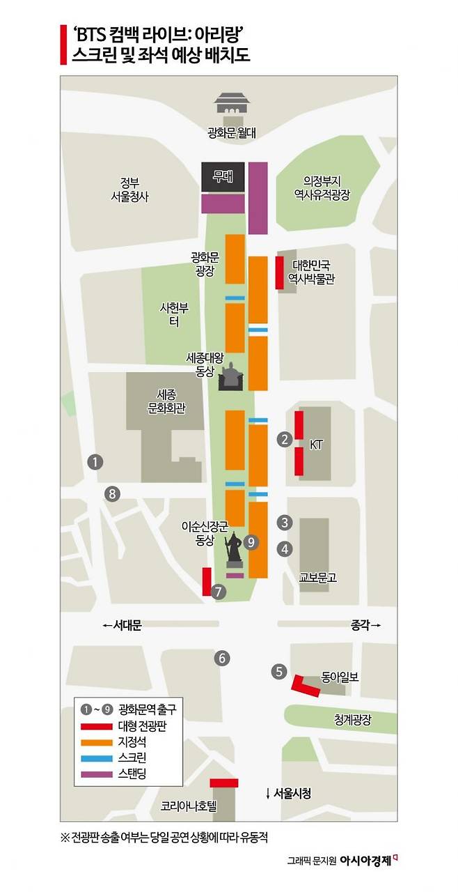안전 문제도 비상이다. 당일 최대 26만명의 인파가 몰릴 것으로 예상됐다. 경찰은 세종대로 등 인접 도로를 전면 통제하고 경찰 특공대를 배치하는 등 최고 수준의 경비에 나선다. 구역별 혼잡도를 실시간 분석하는 '4단계 인파 관리 시스템'도 가동한다. 국내는 물론 해외 팬들 사이에서도 "지난 이태원 사태를 기억하고 안전 가이드를 철저히 따르자"는 자성의 목소리도 나온다. 세종문화회관에선 시민·관객 안전을 위해 예정된 공연 일정을 취소하거나 조율에 들어갔다.