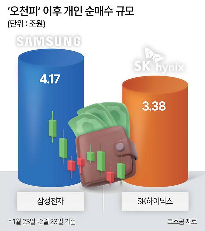 한국거래소에 따르면 코스피가 장중 5000포인트를 돌파한 이후 약 한 달(1월 23일~2월 23일) 동안 개인은 삼성전자를 4조1684억원, SK하이닉스를 3조3785억원 순매수하며 총 7조5000억원 규모를 사들였다.