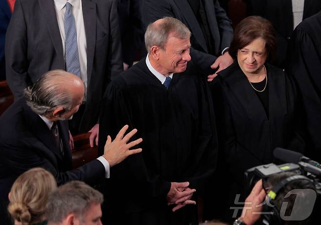 (워싱턴DC AFP=뉴스1) 이정환 기자 = 존 로버츠 미 대법원장과 엘레나 케이건 대법관이 24일(현지시간) 워싱턴 DC 미국 국회의사당 하원 회의장에서 열린 도널드 트럼프 미국 대통령의 2기 첫 국정연설에 참석했다. 로버츠 대법원장과 케이건 대법관은 지난 20일 트럼프 행정부의 상호관세가 위법하다는 판단을 내렸다. 2026.02.24.