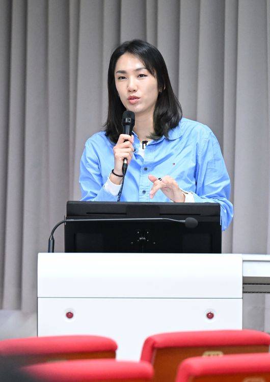 김은혜 해설위원은 선수 시절 경험을 바탕으로 교사들을 대상으로 실전 경기 운영법을 주제로 강의를 진행했다.