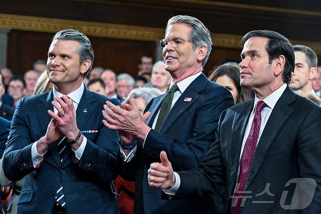(워싱턴DC 로이터=뉴스1) 이정환 기자 = 피트 헤그세스 국방장관(왼쪽)과 스콧 베선트 재무장관이 24일(현지시간) 워싱턴 DC 미국 국회의사당 하원 회의장에서 열린 도널드 트럼프 미국 대통령의 2기 첫 국정연설에서 마코 루비오 국무장관(오른쪽)에게 박수치고 있다. 2026.02.24.