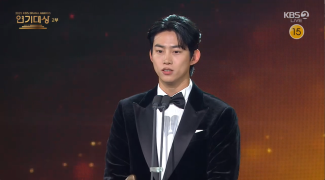 결혼을 공표한 뒤 옥택연은 공개석상에서 예비신부를 직접 언급하기도 했다. 지난해 12월 31일 치러진 '2025 KBS 연기대상'에서 '남주의 첫날밤을 가져버렸다'로 미니시리즈 부문 남자 우수상을 받은 옥택연이 수상소감에서 예비신부의 이름을 직접 발언한 것이다.