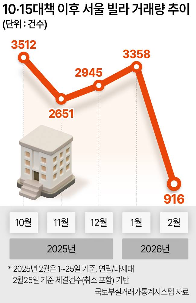 25일 국토교통부 실거래가통계시스템에 따르면 이날 기준 서울의 연립·다세대 거래 체결 건수는 916건으로 전달(3358건) 대비 약 27% 감소했다. 연립·다세대 거래 건수는 지난해 10·15대책 이후 11월 1000건 가까이 감소했다 12~1월 들어 상승세를 보였었다. 그러다 최근 한 달 사이 다시 급감세로 돌아섰다.