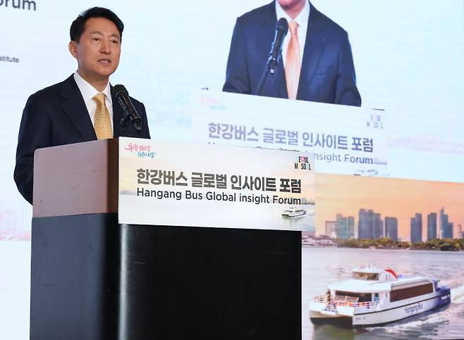 [오세훈 서울시장이 24일 서울 마포구 호텔나루에서 열린 '한강버스 글로벌 인사이트 포럼'에서 인사말을 하고 있다. (사진=연합뉴스)]